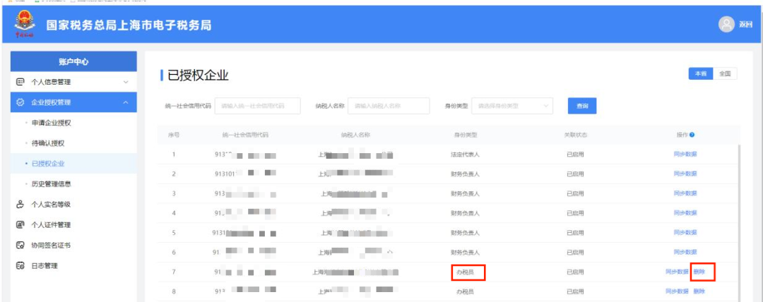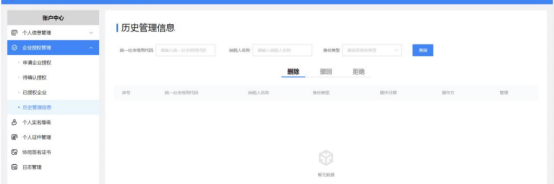 您可以在【账户中心】—【企业授权管理】—【历史管理信息】中可以查看删除、撤回、拒绝的历史信息。