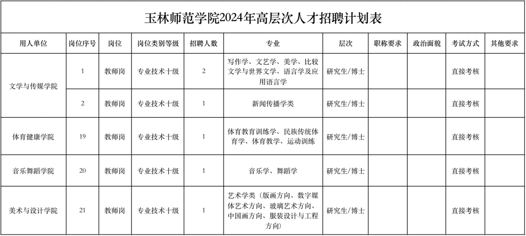 2.应聘方式:填写《玉林师范学院高层次人才应聘登记表》,并将个人应聘简历、学历学位(中国大陆境外的学历学位须取得中国教育部留学服务中心认证)、职称、学术成果等材料做压缩包,以“XX学博士或高级职称+姓名应聘”为主题,发邮件到我校招聘邮箱ylsygkzp@163.com即可。资格核查由各用人单位组织进行,应聘人员资格核查贯穿于招聘、聘用工作始终。应聘人员需如实填写、提交相关个人信息资料,如有弄虚作假,取消其应聘资格。各岗位可随报随考,由用人单位直接考核,方式一般为试讲,时间及地点由各用人单位与应聘人员确定。学校人事处根据考核结果组织考察应聘人员的政治思想表现、道德品质和工作业绩等情况,可采取面谈、外调等形式。根据考核结果择优确定拟聘用人员,按《关于进一步规范事业单位公开招聘体检工作有关问题的通知》(桂人社规〔2019〕11号)及相关规定开展体检工作,体检标准参照公务员录用体检标准执行,体检费用由拟聘人员自理。体检合格者在广西人才网和玉林师范学院官网“公开招聘”专栏上公示7 个工作日。公示内容包括拟聘人员姓名、性别、专业、学历学位、拟聘岗位等。 经公示无异议人员,按有关规定办理聘用手续并在广西人社厅和编办备案、登记,签订事业单位聘用合同。(一)本次招聘考试应聘人员、招聘单位和招聘工作人员违纪违规的,按照《事业单位公开招聘违纪违规行为处理规定》(人社部令第35号)有关规定从严处理。 (二)本次招聘监督举报电话为:0775-2881602。招聘联系人及联系方式:刘老师、李老师,0775-2666158。