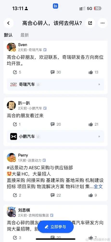与此同时,高合汽车的停产也引发了其他车企的行动。一些知名车企如一汽大众、赛力斯、理想等开始挖掘高合的员工。据网友截图显示,这些车企正在积极邀请高合前员工加入他们的团队。求职平台上,各大车企的HR也在线招聘,吉利、奇瑞、小鹏等车企以及远景动力等供应链厂商纷纷欢迎高合员工投递简历。