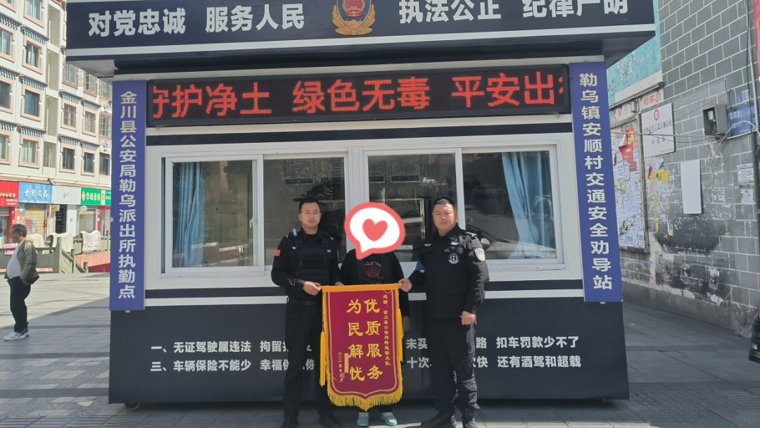 为感谢金川公安及时将钱追回,老人专程将一面印有“优质服务 为民解忧”的锦旗送到特巡警大队民辅警手中,感谢他们的辛勤付出。