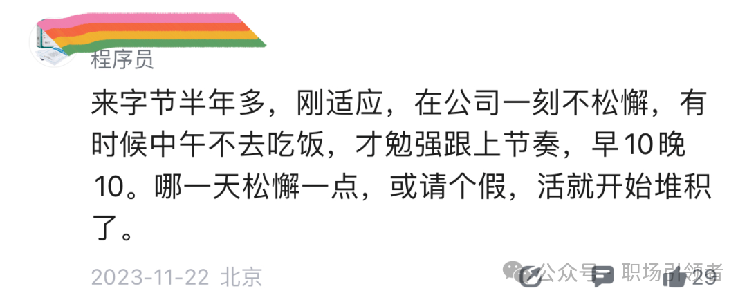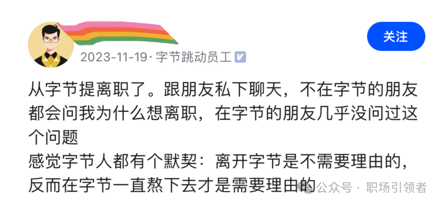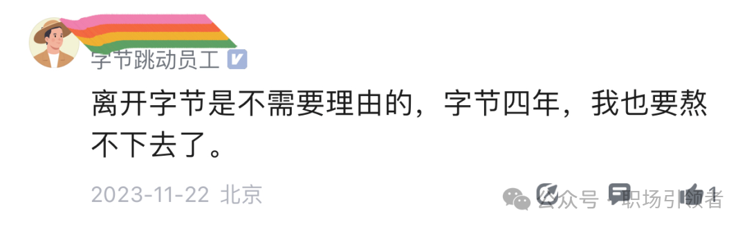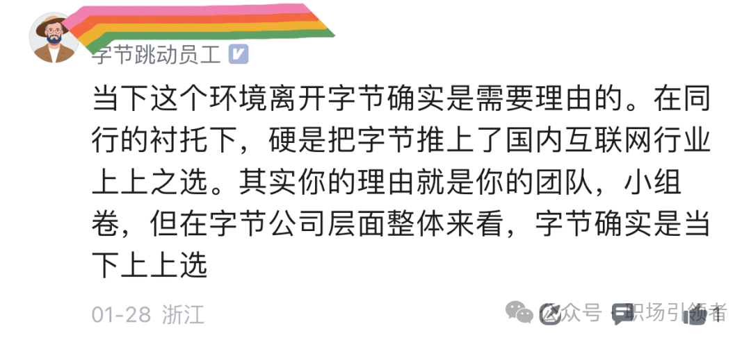 对比字节跳动与其他公司的工作环境,有的员工提出,尽管外界对字节的认知是高薪酬、高工作强度,但实际上,离开的理由远不止这些。许多人离开是因为团队或小组内的竞争压力,或是公司整体策略与个人职业目标不再匹配。在这样的情况下,离开成了寻求新机会、新挑战以及实现个人价值和生活平衡的选择。