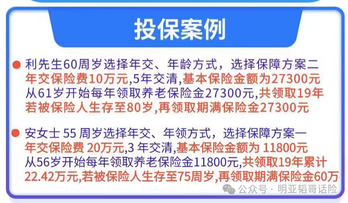 2)领取方式:即交即领,第一年就能领取养老金,保证领取20年