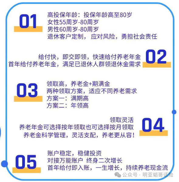 1)投保年龄:女性55周岁-80周岁,男性60周岁-80周岁