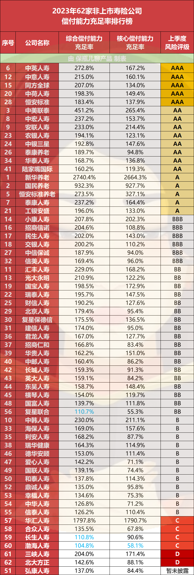 另外2023年,第2、3季度的综合风险等级为AAA,可以看到评为3A的寿险公司也就仅有5家。