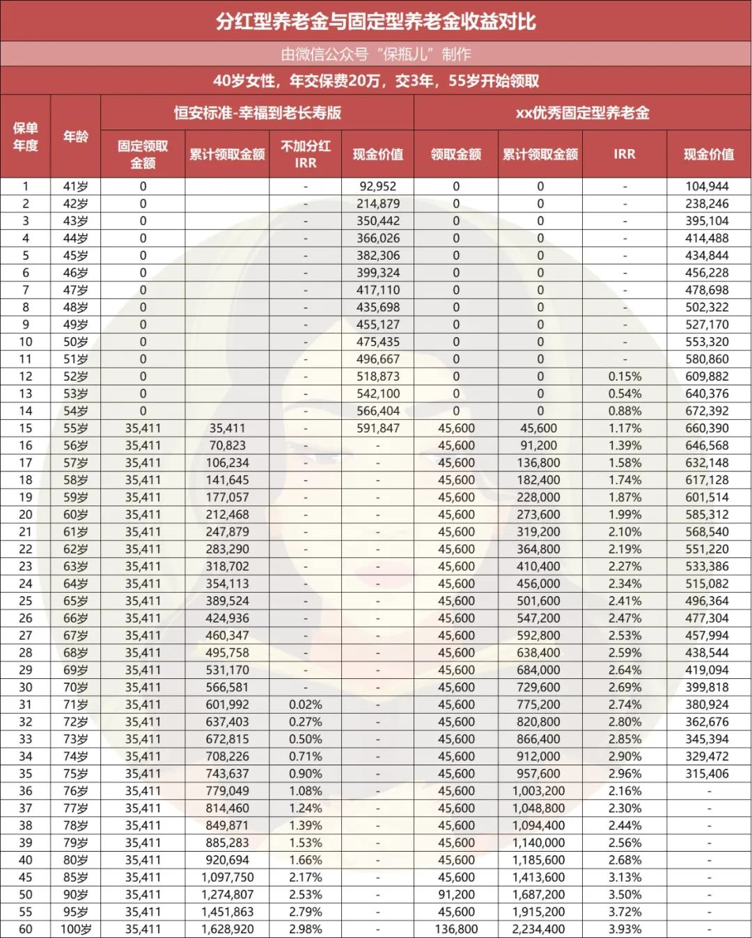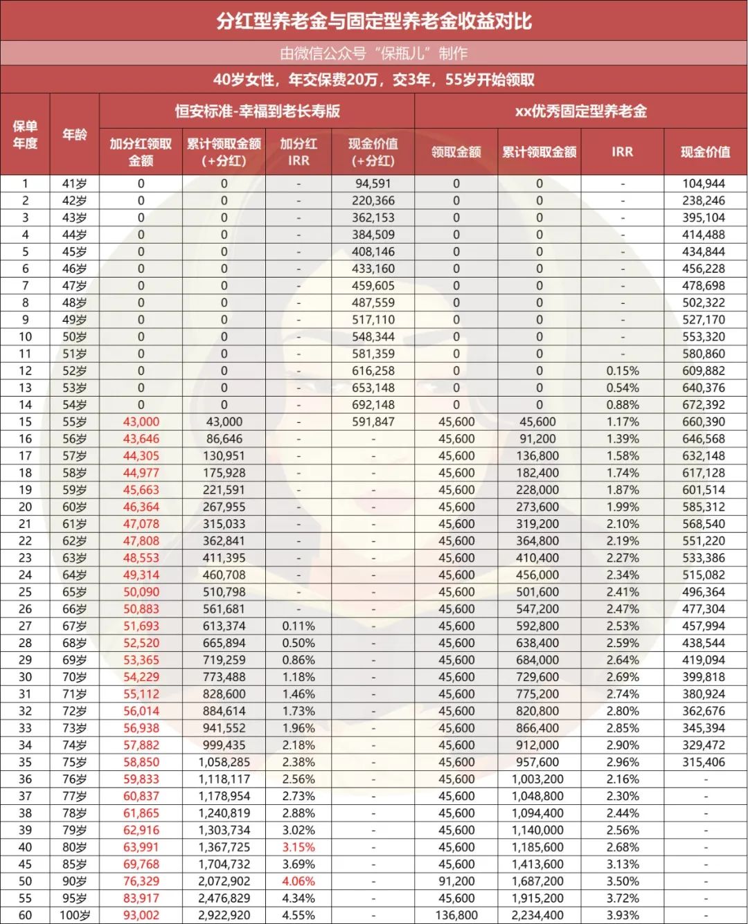 加上分红收益后,分红型养老金的优势就非常明显了。(标红的那一栏)