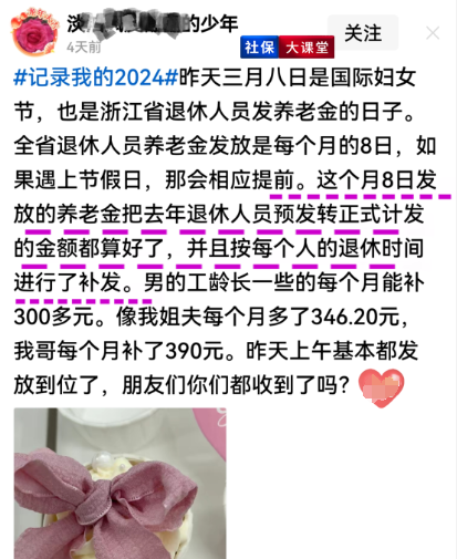在经历了一年的期待后,许多省份的退休人员已经迎来了养老金重算补发的喜讯。以浙江省为例,大约在3月8日左右,许多退休人员收到了数额不菲的补发款项,这不仅是对他们去年以来的等待的回应,更是对他们生活水平改善的直接体现。在浙江的具体案例中,有网友分享了家庭成员每月额外收到的346.2元和390元的补发款,这些数字虽小,但却映射出退休人员生活的微妙变化和政府政策的温暖。
