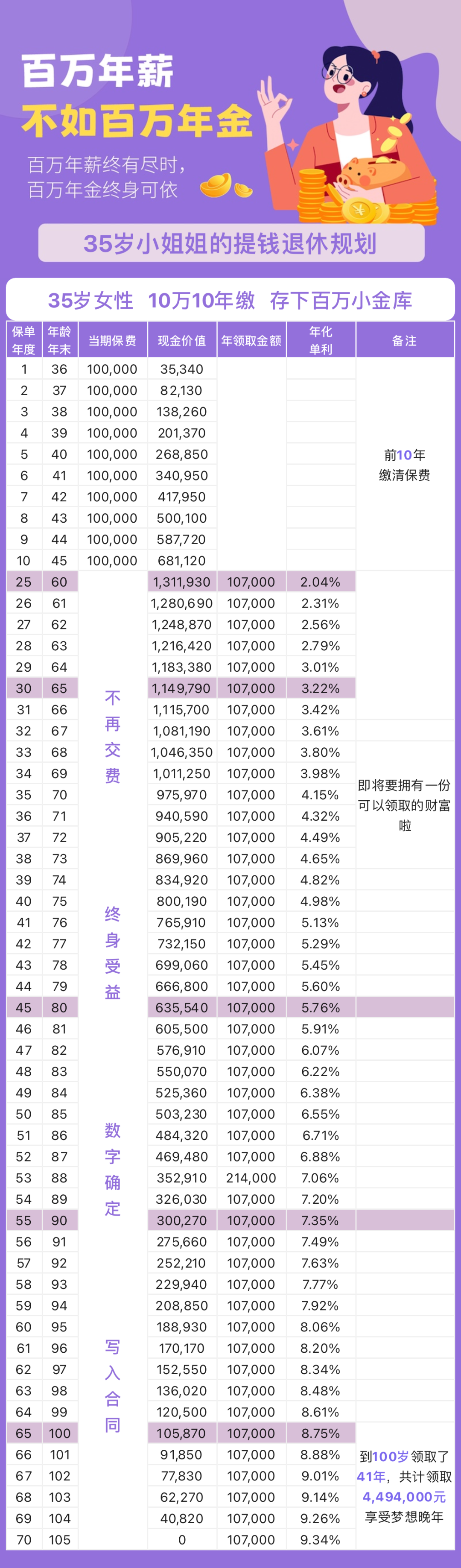 举个例子,35岁小姐姐为自己规划商业养老金,年交10万,10年交,存下百万养老金鹅池。