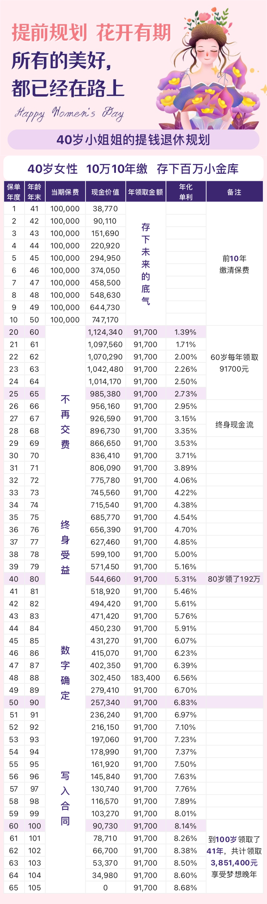 假设你是从40岁才开始规划,同样花费100万,每年领取的金额是91700元,每月领取7794元。