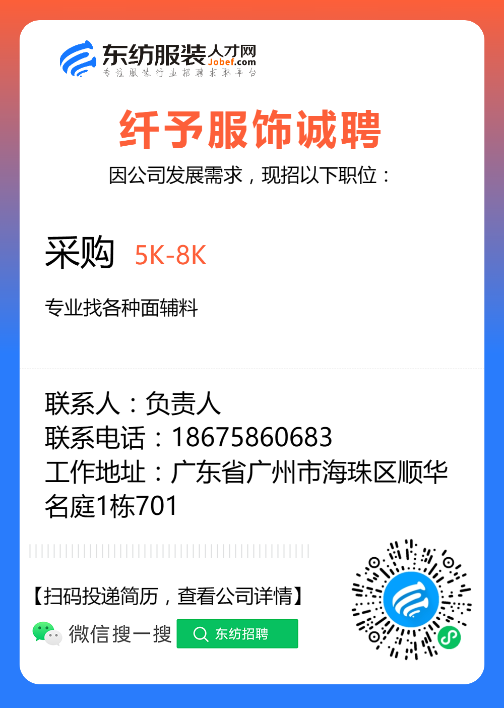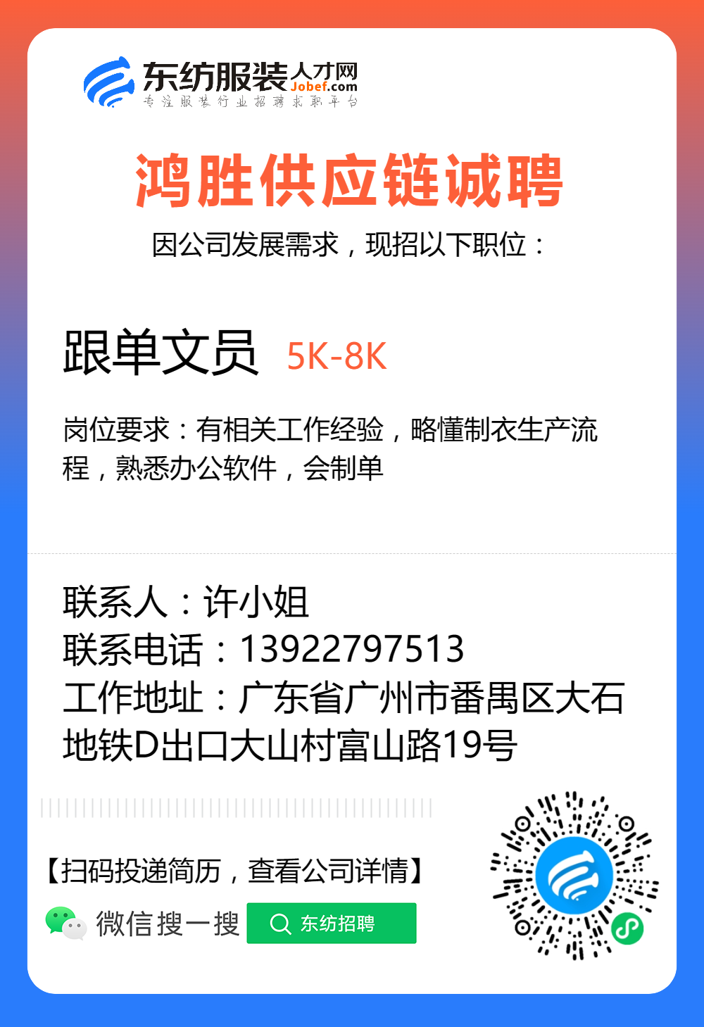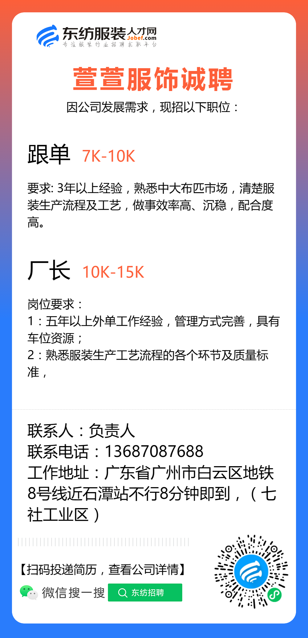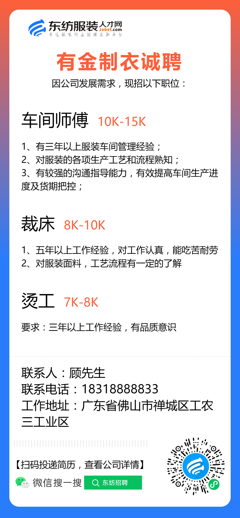 >服装招聘·工厂类丨3. 17号,跟单、采购、车位、裁床、尾部……