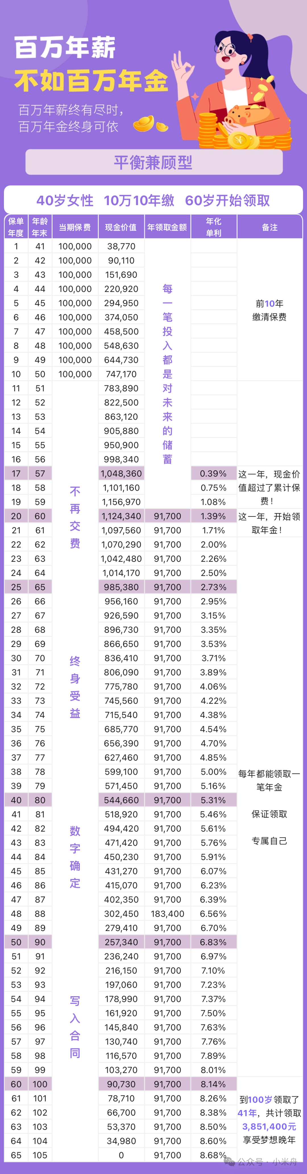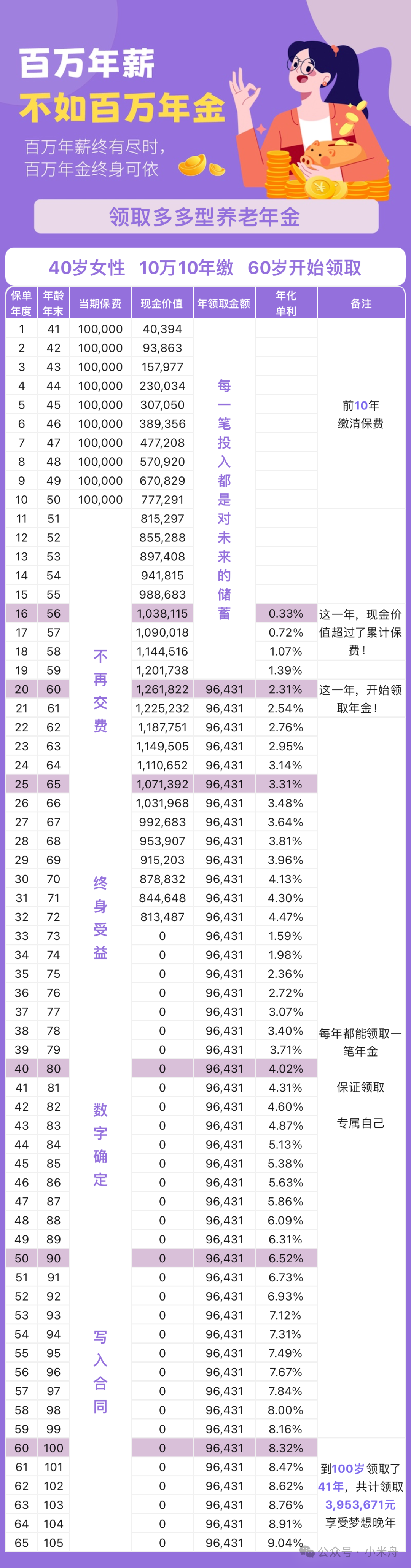 以40岁女性,每年交10万,交10年,60岁开始领取为例。