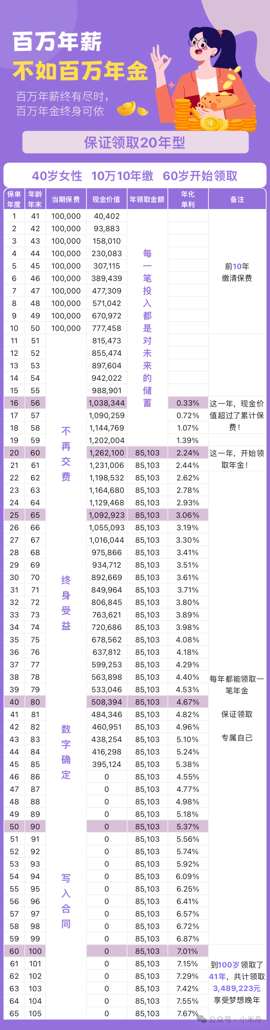 还是以40岁女性,每年交10万,交10年,60岁开始领取为例,每年领取85103元,每月领取7233元,保证领取20年,领取终身。