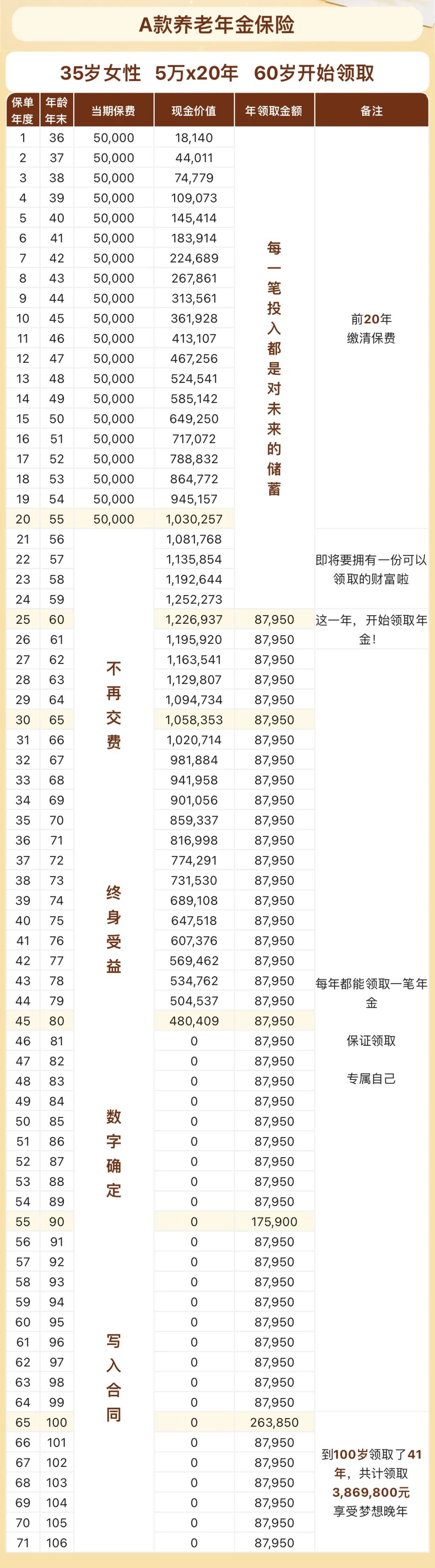 A款是终身领取,并且保证领取20年的养老金,也是市场上最常见的类型。