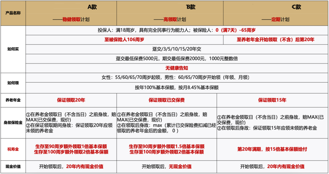 三款产品各有优劣,满足不同人群的养老规划需求,分别是稳健领取计划(A款)、高领取计划(B款)、定期领取计划(C款)。