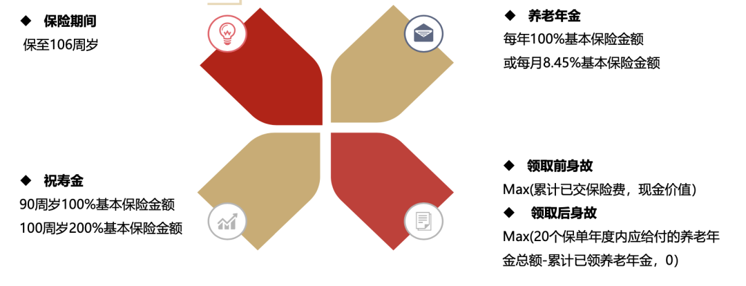 90岁时,除了领取当年度的养老金外,额外获得一笔祝寿金,为基本保额(每年领取金额)的100%。