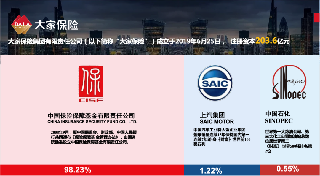 大家保险集团有限责任公司由中国保险保障基金(持股98.23%)、中国石油化工集团(持股0.55%)、上海汽车工业 (集团)总公司(持股1.22%)共同出资设立,注册资本203.6亿元,是一家业务范围覆盖养老保险、财产保险、人身保险、资产管理等领域的综合型保险集团。