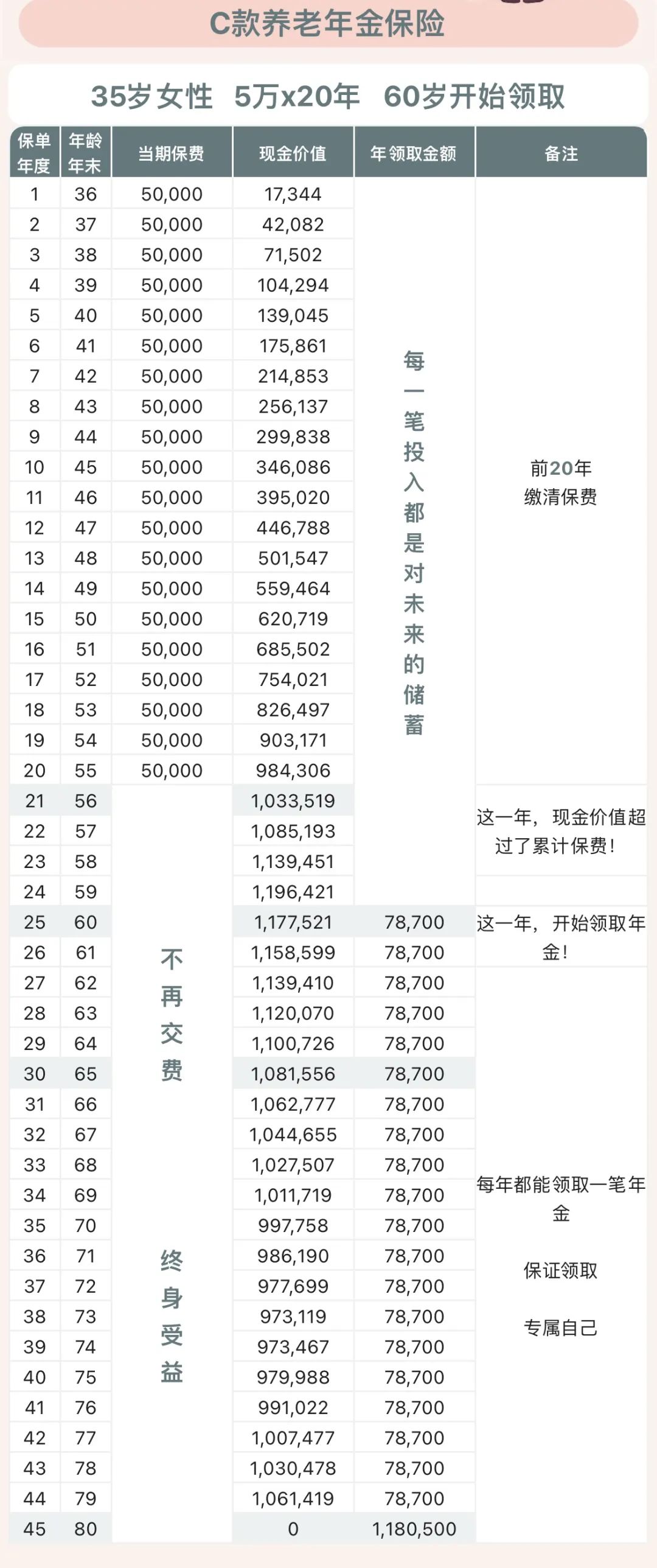 从上面的测算可以看出,C款的最大特点是:领取节奏快——用20年快速领回35年的养老金。特别适合想要早点领回一大笔钱的人。
