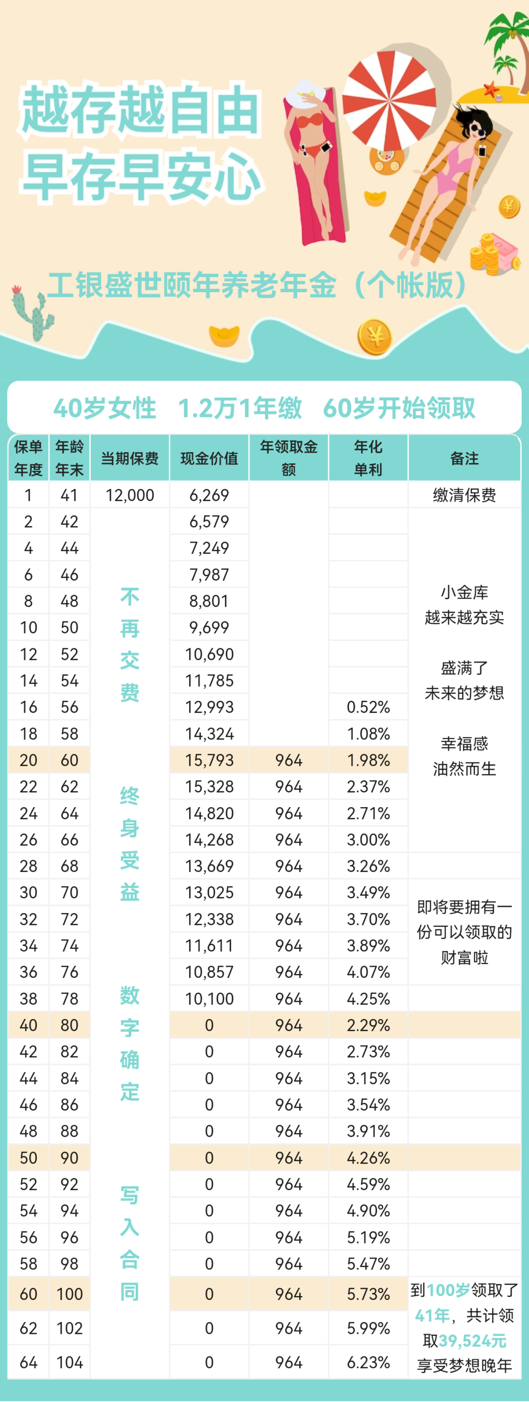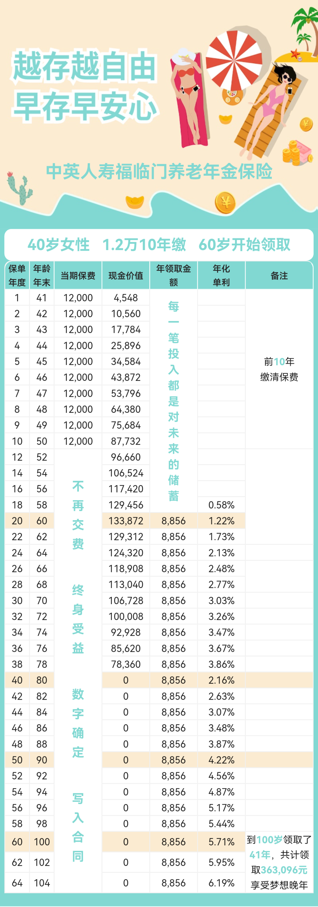 40岁姐姐,每年缴费1.2万,连续缴费10年,共缴费12万;