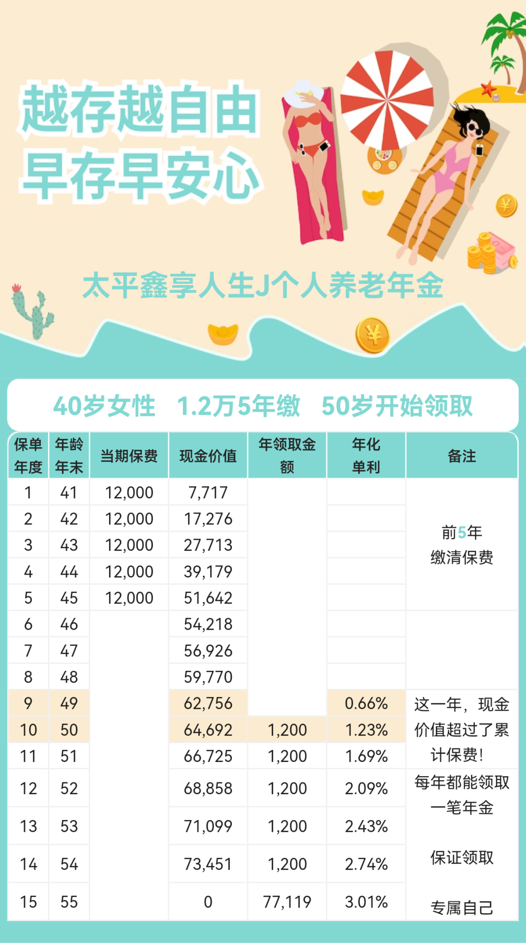 40岁姐姐,每年缴费1万2,连续缴费5年,共6万;