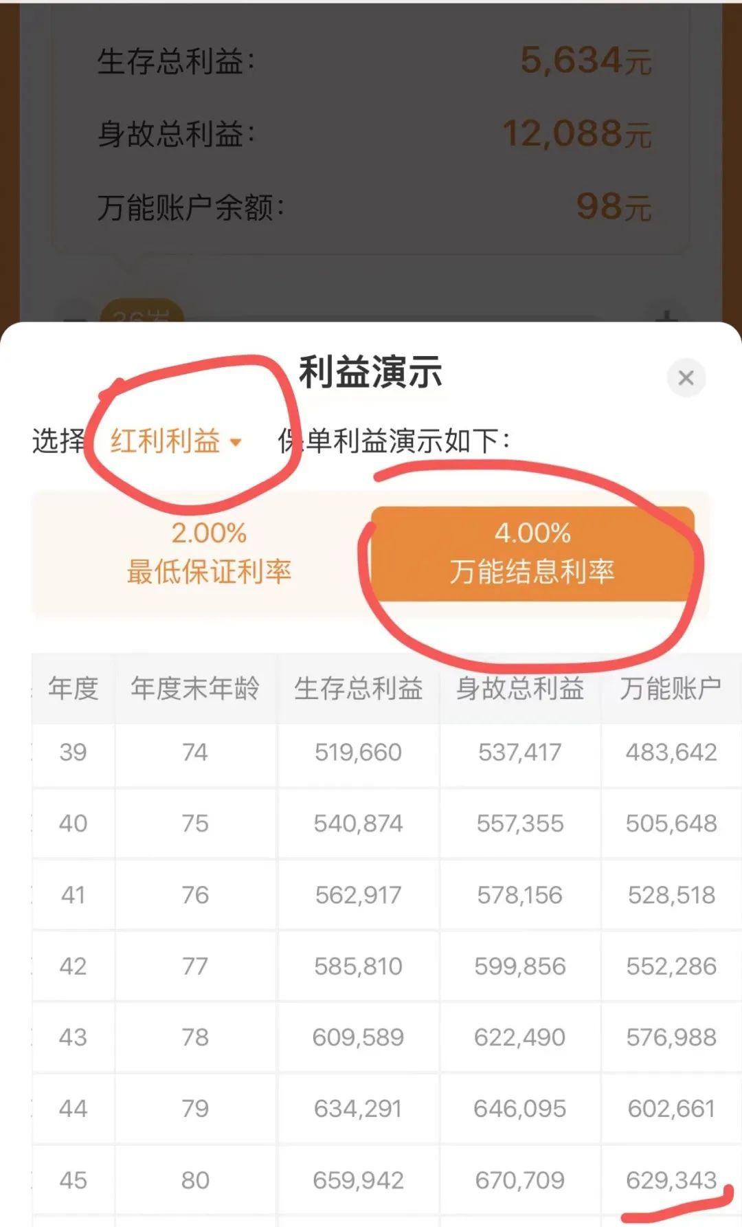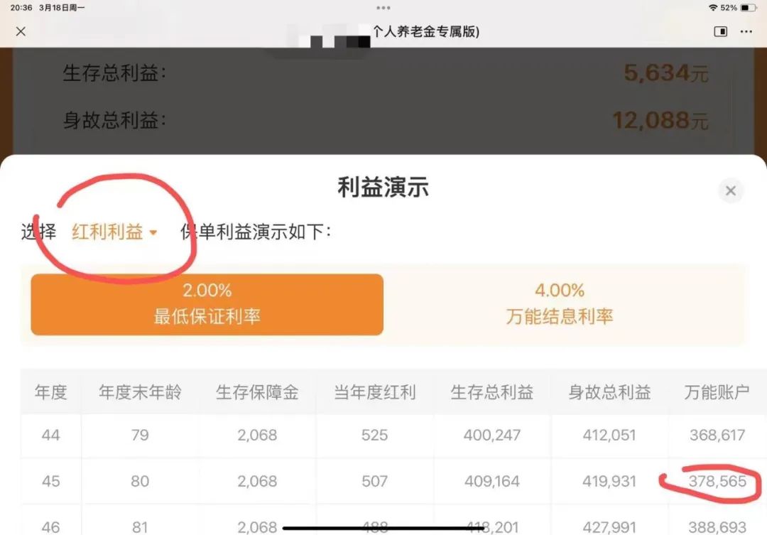 但是,这37.8万,还是在选择了红利利益进行叠加的金额呀!准确的是要看下图: