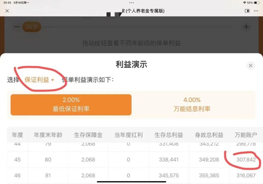 在我的一再追问的情况下,对方代理人稍微松了口说,保证万能账户最低保证利率的情况下,80周岁账户里有37万。