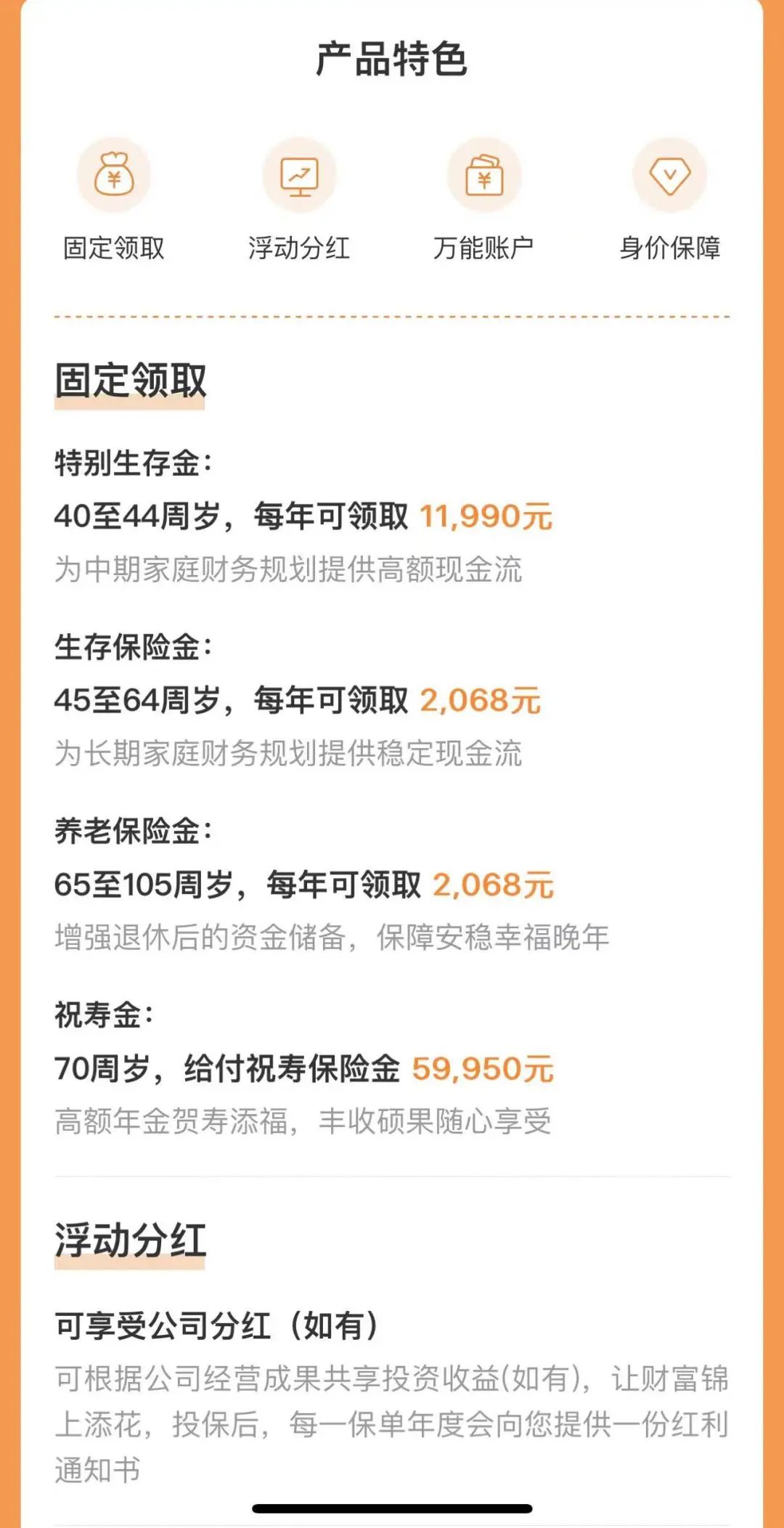 上述方案中,除了40周岁到44周岁这五年每年的近1.2万和70周岁的祝寿金之外,其余保险合同年度都只能领取2068元。试想一下,55岁以后,每年2000+,是否够用?