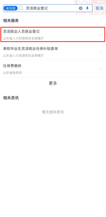 1、进入“爱山东”APP、微信、支付宝小程序,首页搜索“灵活就业登记”,点击进入;