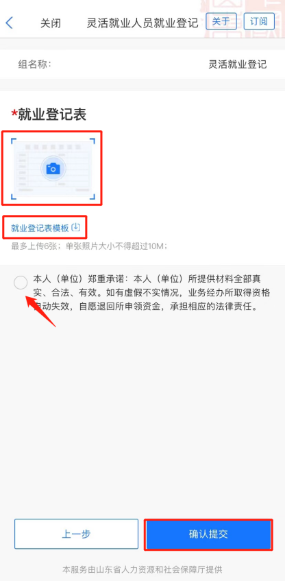 5、上传就业登记表后,勾选承诺,提交灵活就业人员登记。(注:就业登记表可点击“就业登记表模板”处查看)