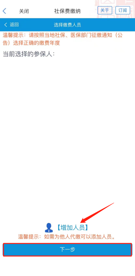 4、点击下方“增加人员”,输入缴费人身份信息后,点击“下一步”;