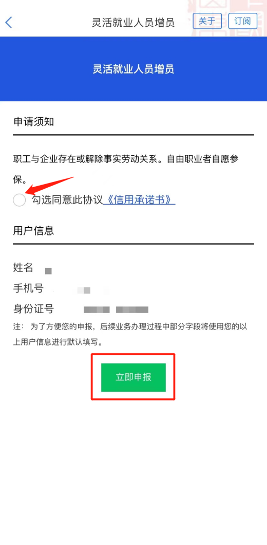 2、确认信息,勾选同意协议后,点击“立即申报”;