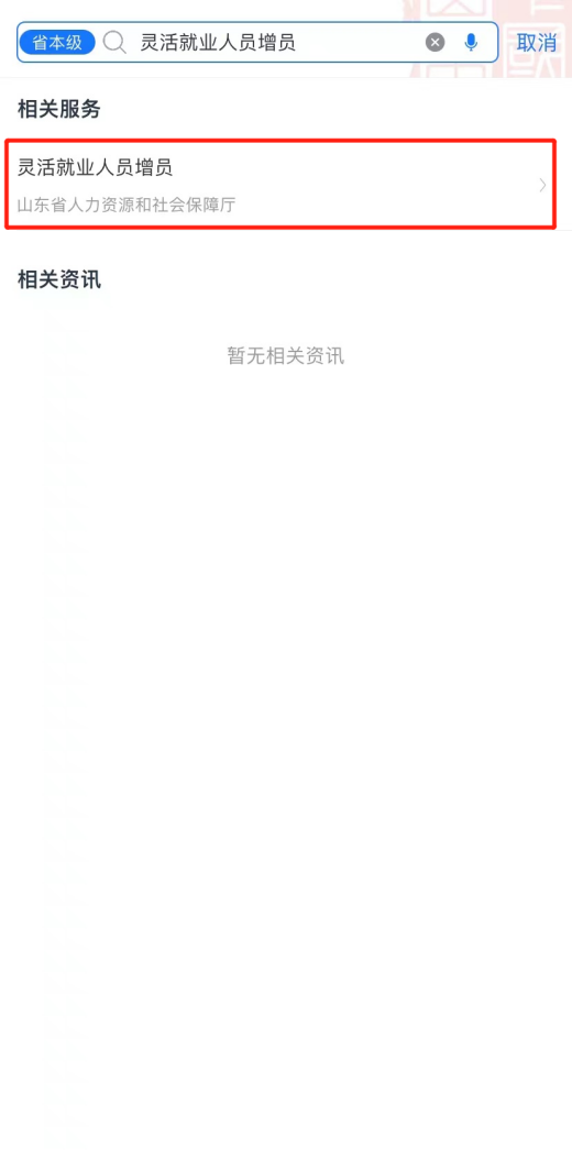 1、进入“爱山东”APP,首页搜索“灵活就业人员增员”,点击进入;