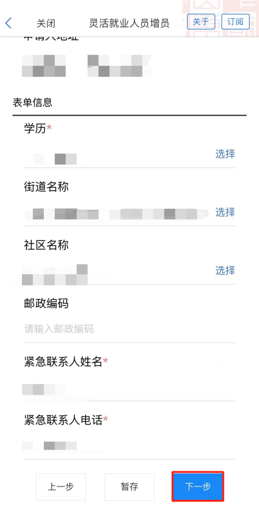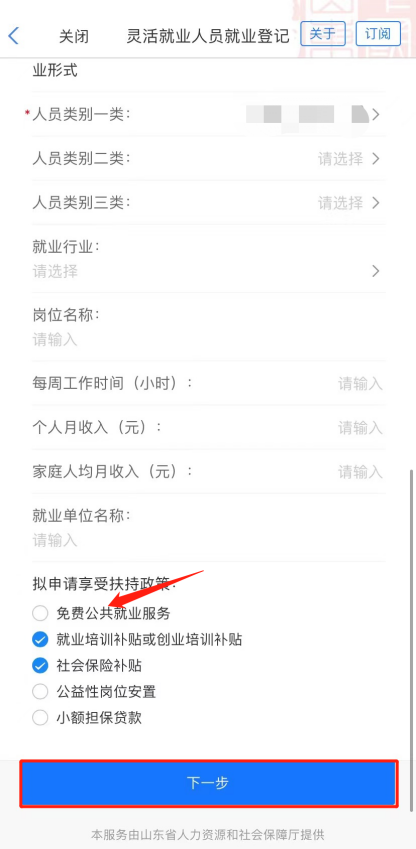3、确认基本信息,填写办理地、就业所在地、灵活就业类型等信息,选择拟申请享受扶持政策,点击“下一步”;
