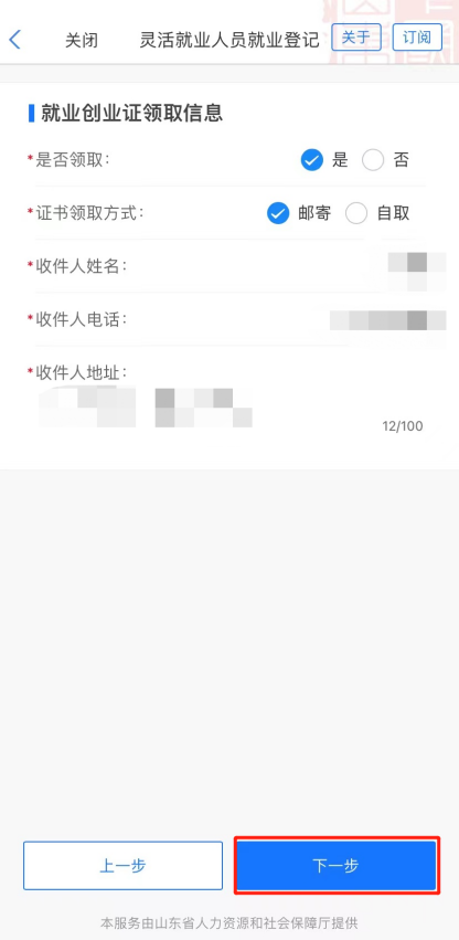 4、选择是否领取就业创业证,如领取需填写邮寄地址;