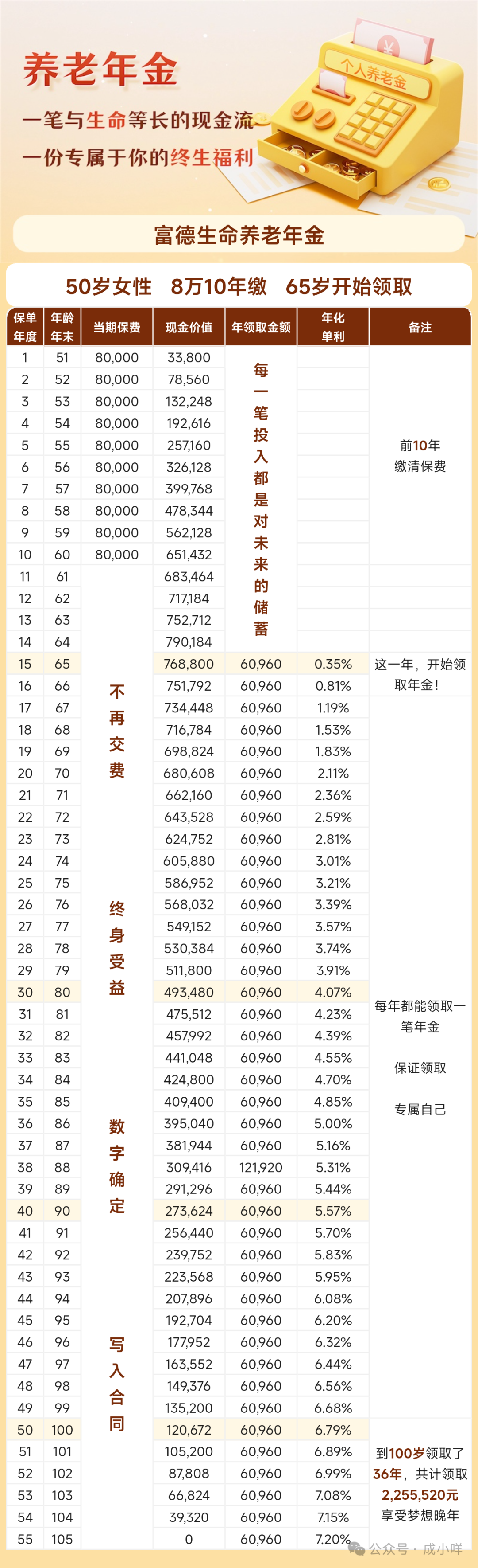 例如这款3月底可能就要下架的优秀养老产品,50岁开始年交8万,交10年;从65岁开始就可以每月补充5000元的养老金,一直领到生命等长。仅仅领到80岁的年化就到了4%,并且一边领取还一直有现价,自己领不到了还可以给孩子留下一笔钱。是最近非常多人入手的一款养老年金了。