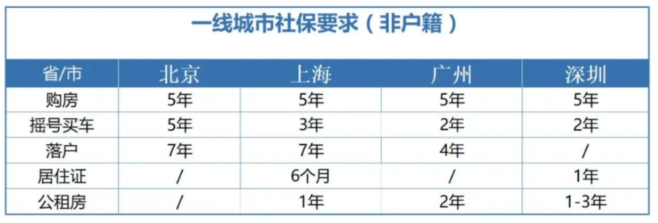 从这张图可以看出,社保缴费在一线城市有多重要。虽然现在买房政策在不断放宽,但还有其他诸多方面与社保挂钩。