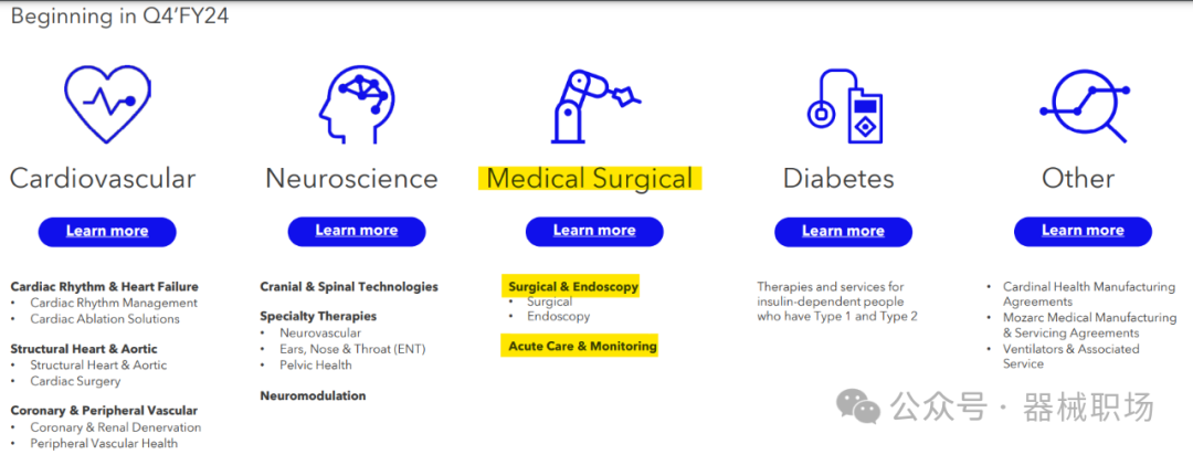 在美敦力的最新业务架构中,医疗外科被调整到了第三位,由外科与内窥镜、急症护理与监护组成。