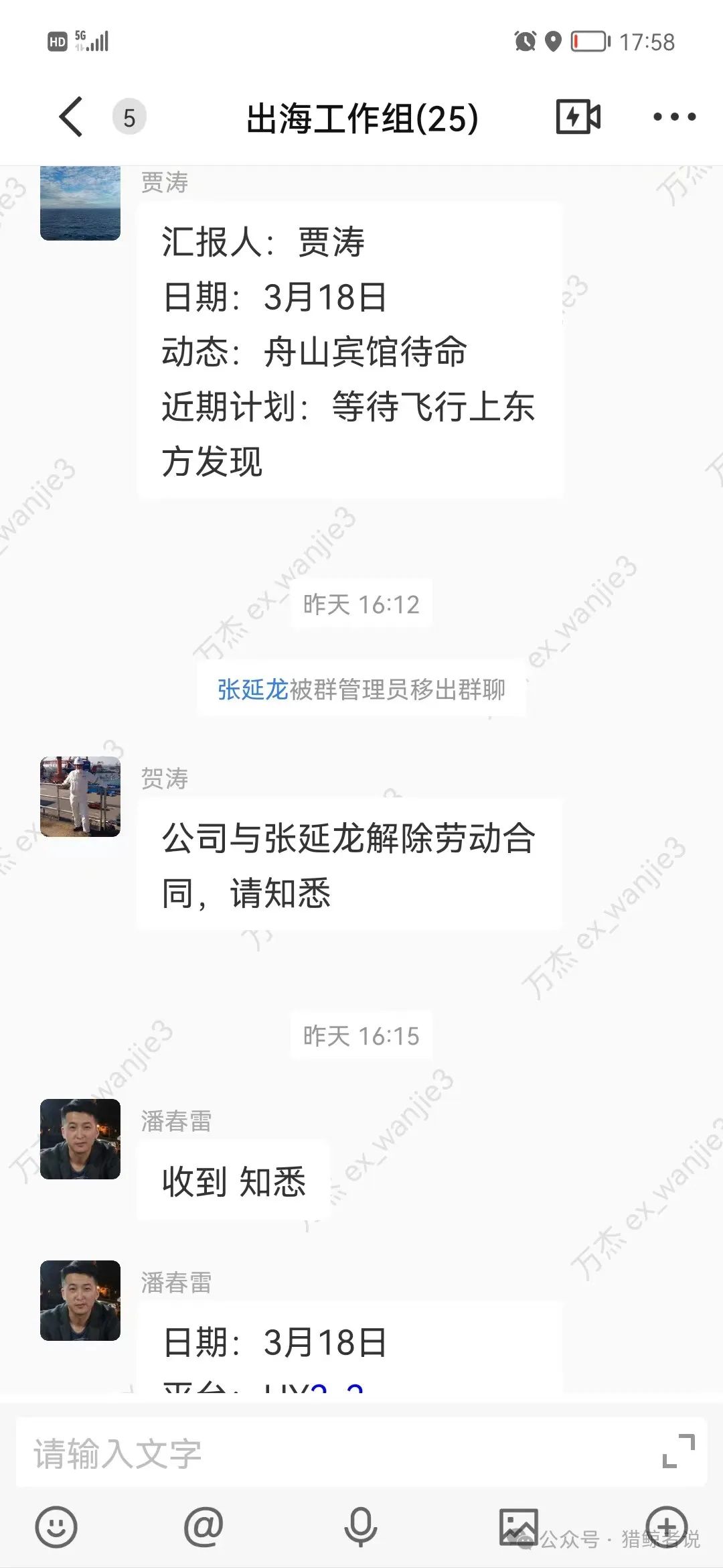 对了,还没有辞退呢,也没有签署离职申请,已经把账号删了,海油移动云登陆不上了,同事给发的照片显示被管理员移除群聊,还说公司已经和我解除合同,我也不知道什么时候解除的劳动合同。