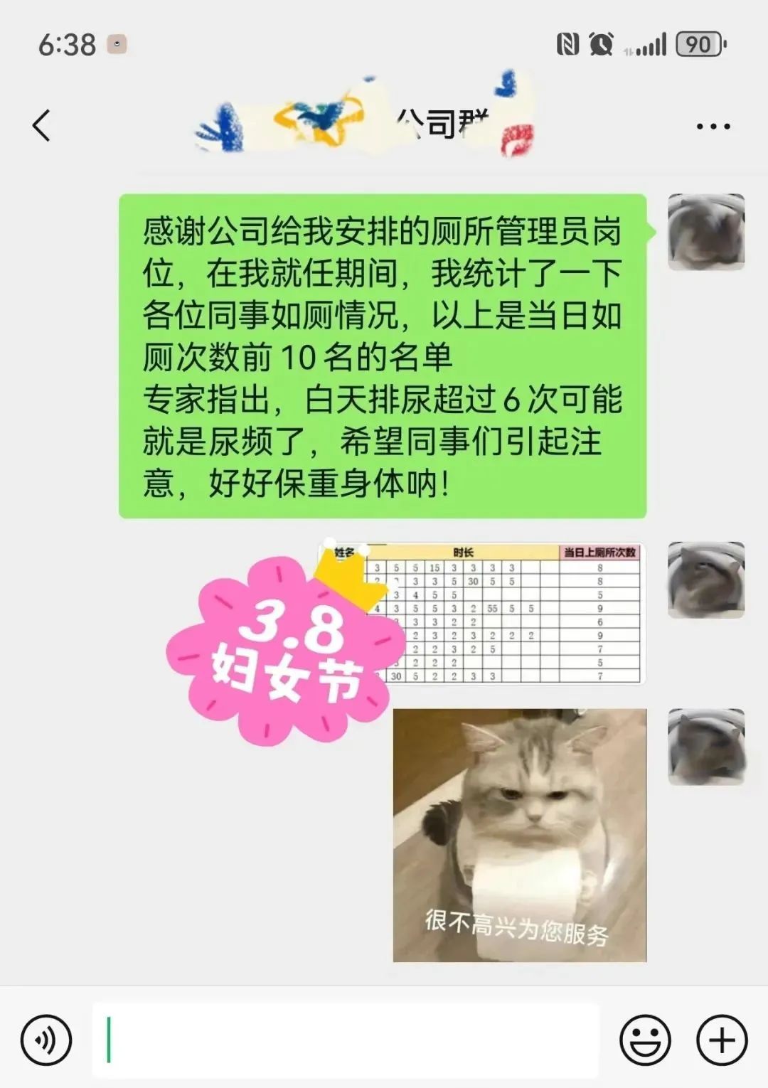 她的经历发布之后引起了网友的热议,有人在下面评论建议:“做个表格,记录同事每天上厕所时间和次数,发到公司群。只要我发疯,谁都别想好过。”这位网友采纳了建议,默默给上厕所的同事计时。