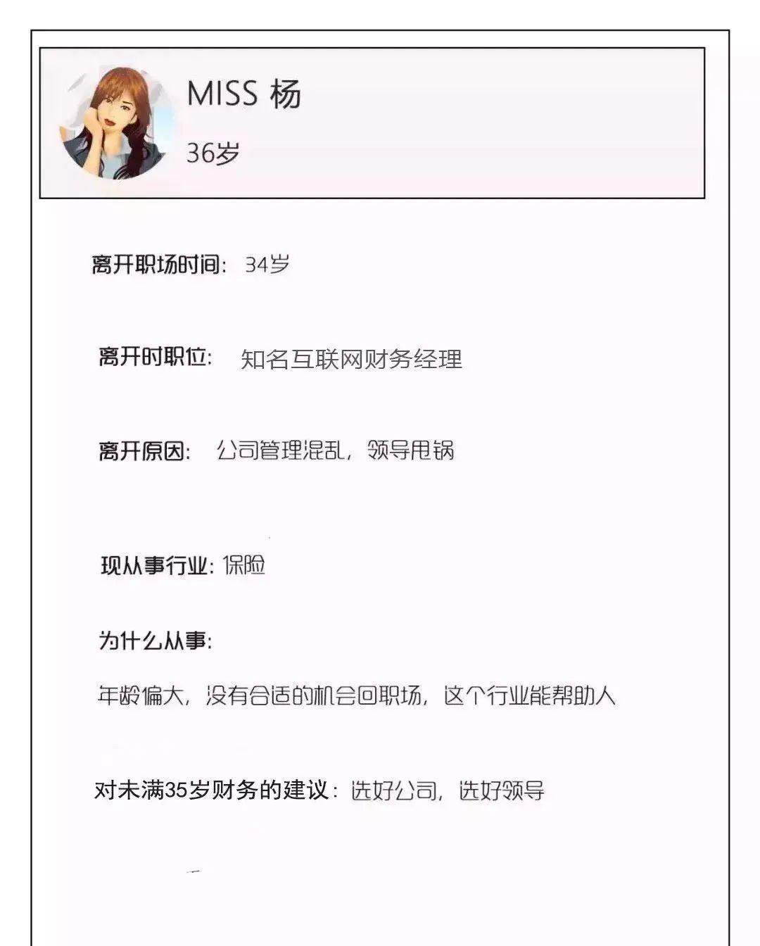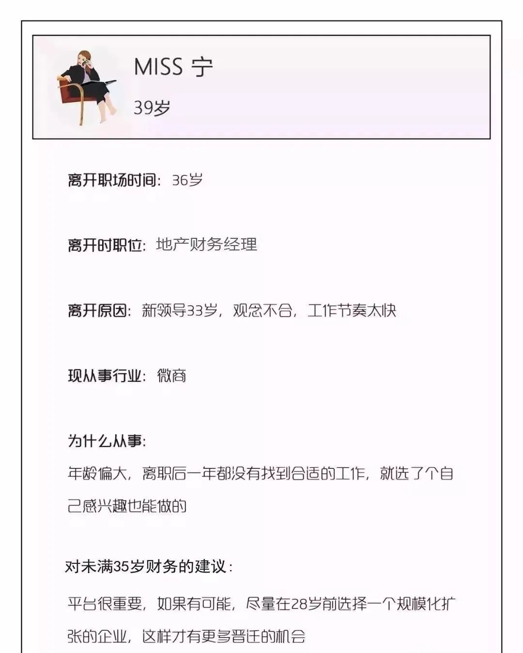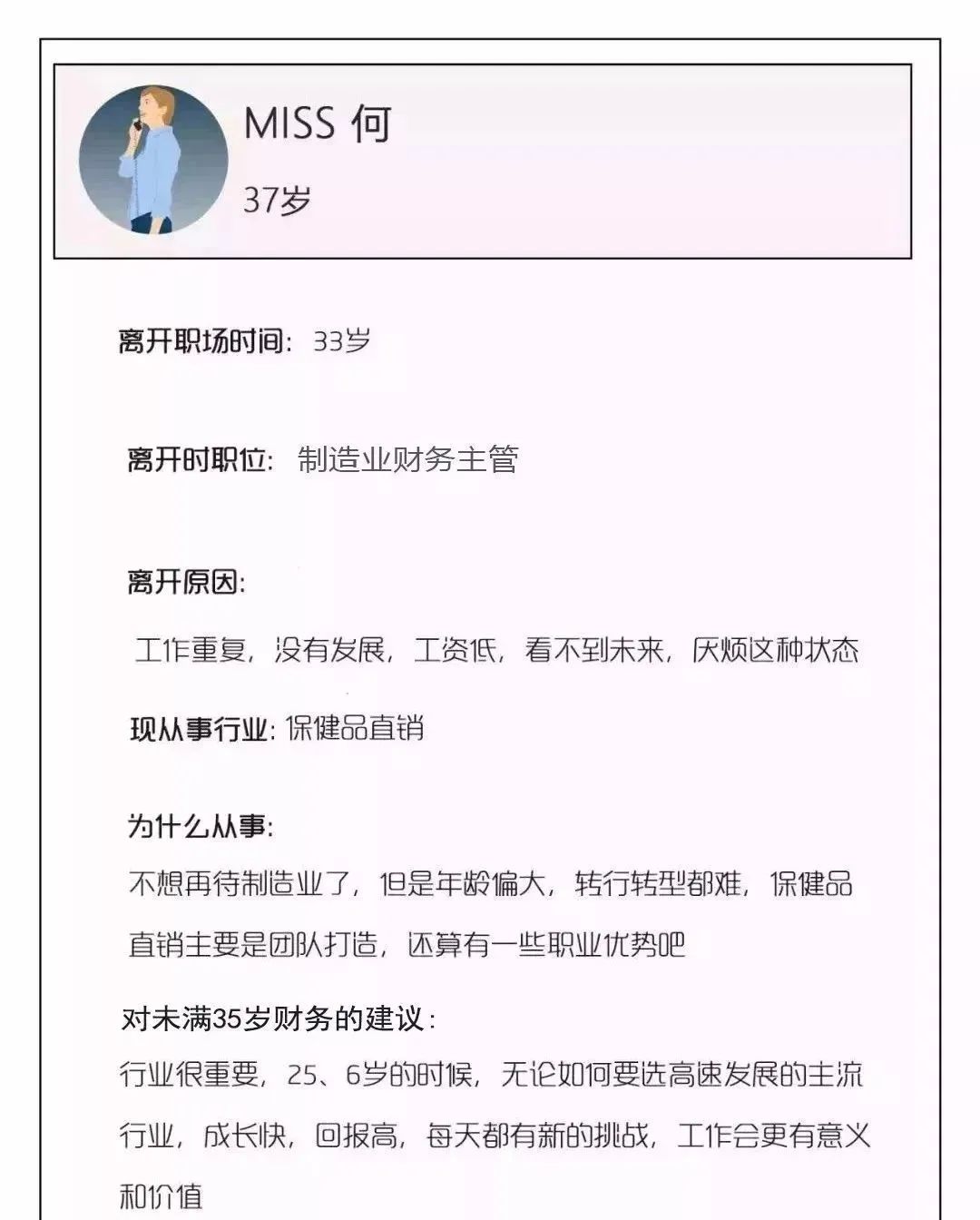 事实上,大家离开公司的理由各有不同,但是离开职场的原因却高度统一,年龄偏大,职位没到总监,找不到合适的工作机会。