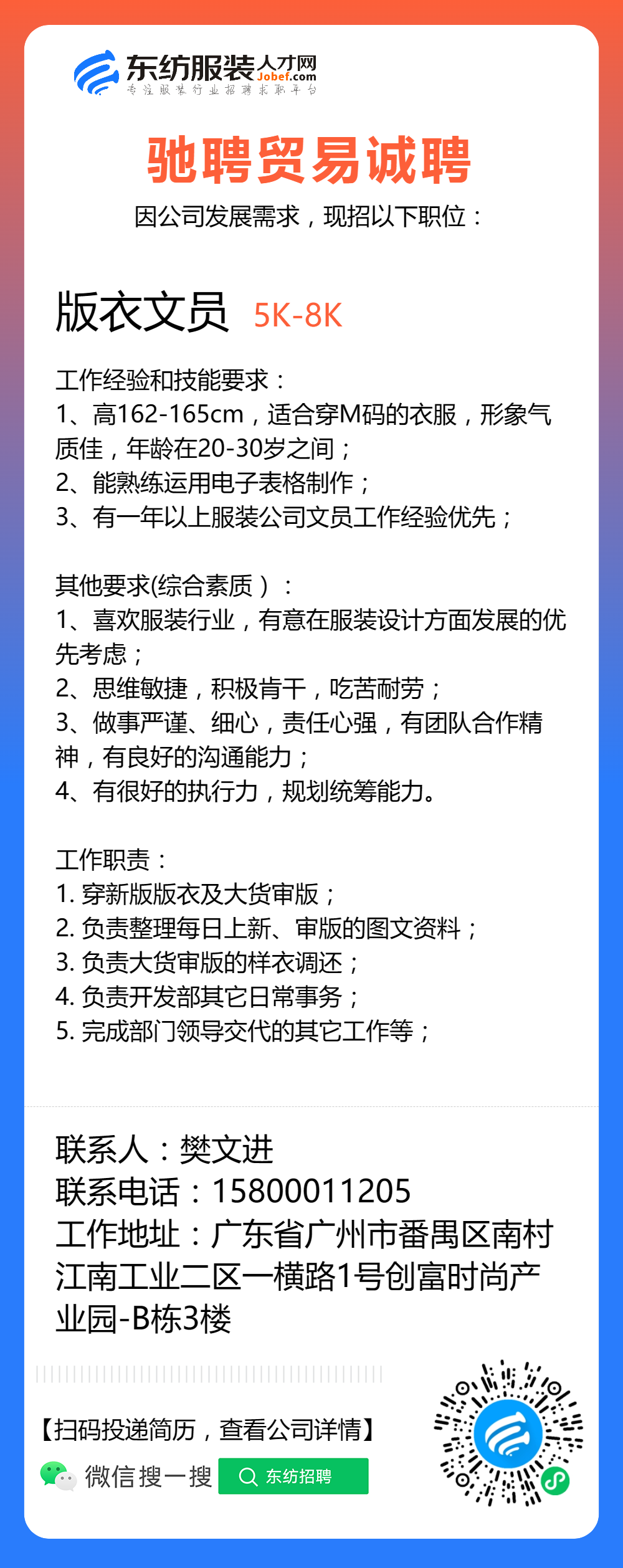 服装招聘·工厂类丨3. 20号,跟单、采购、车位、裁床、尾部……