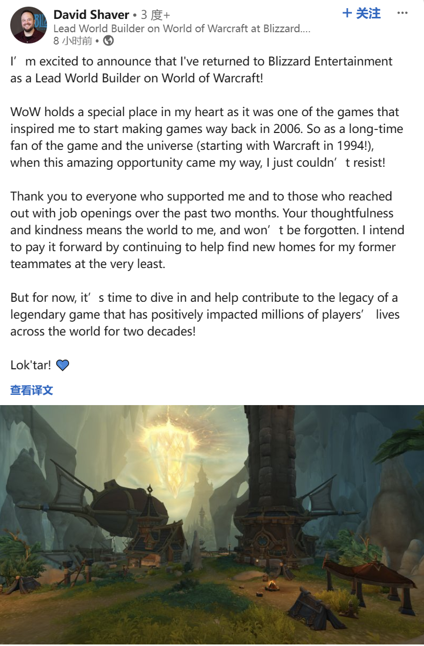 前段时间,由于奥德赛项目的取消,整个工作组都遭到裁员,哀嚎声一片。而这位前暴雪员工大卫·谢弗非常幸运,在离职不久后又重新入职了暴雪,并担任魔兽世界首席架构师。