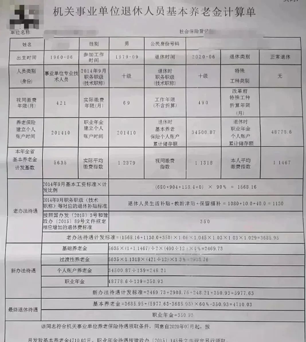 比如这位体制内退休员工,按老办法,基本养老金为3686,新办法为5978;因为2020年退休,所以最终退休工资为:3686+(5978-3686)*60%=5061。