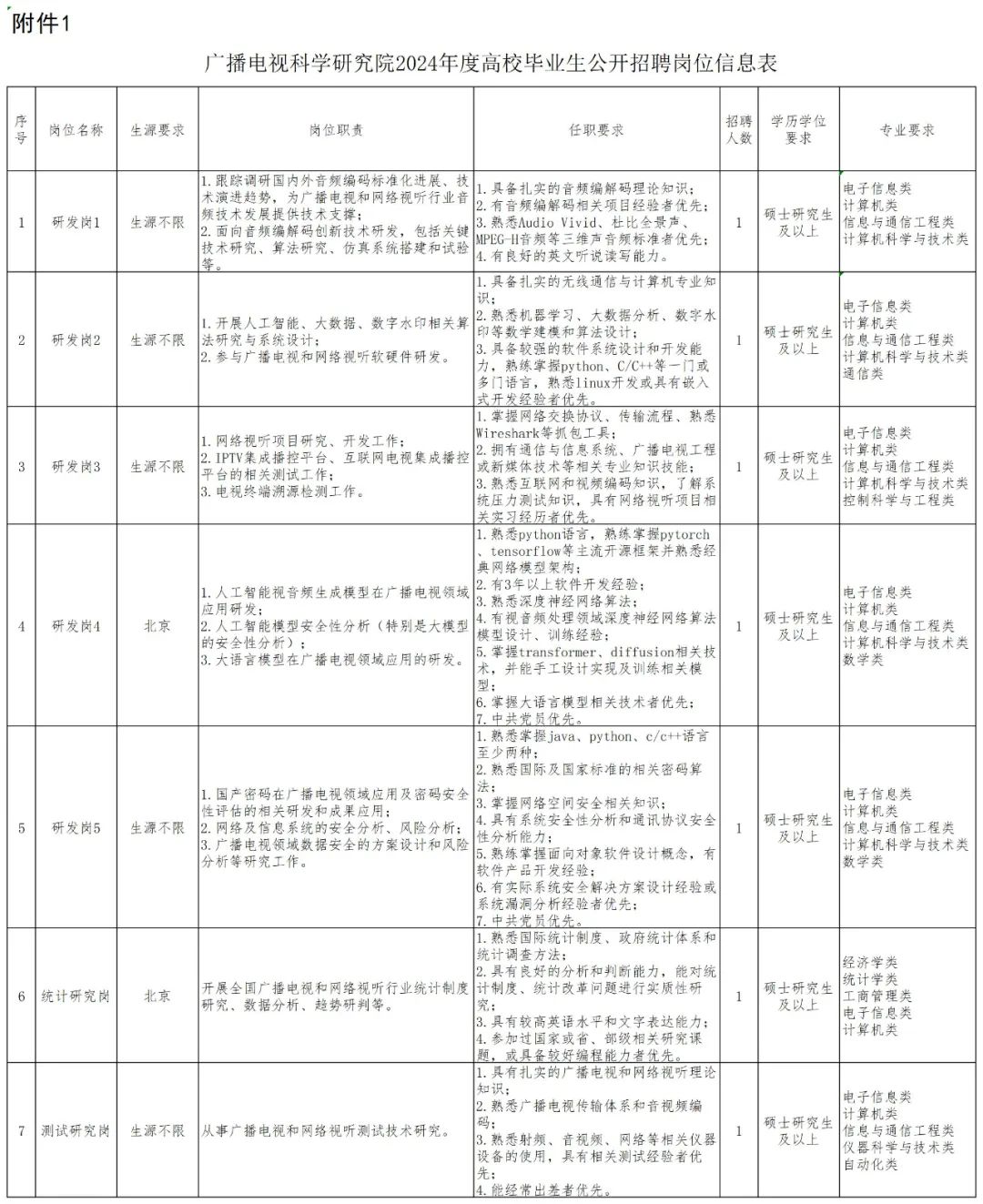 根据工作需要广播电视科学研究院2024年度拟公开招聘高校毕业生7名。实际招聘人数以上级单位下达接收计划为准。具体事项如下:
