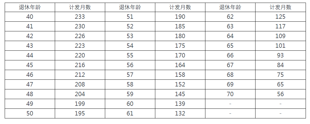 式中“本人退休年龄相对应的计发月数”执行国家统一规定,详见下表: