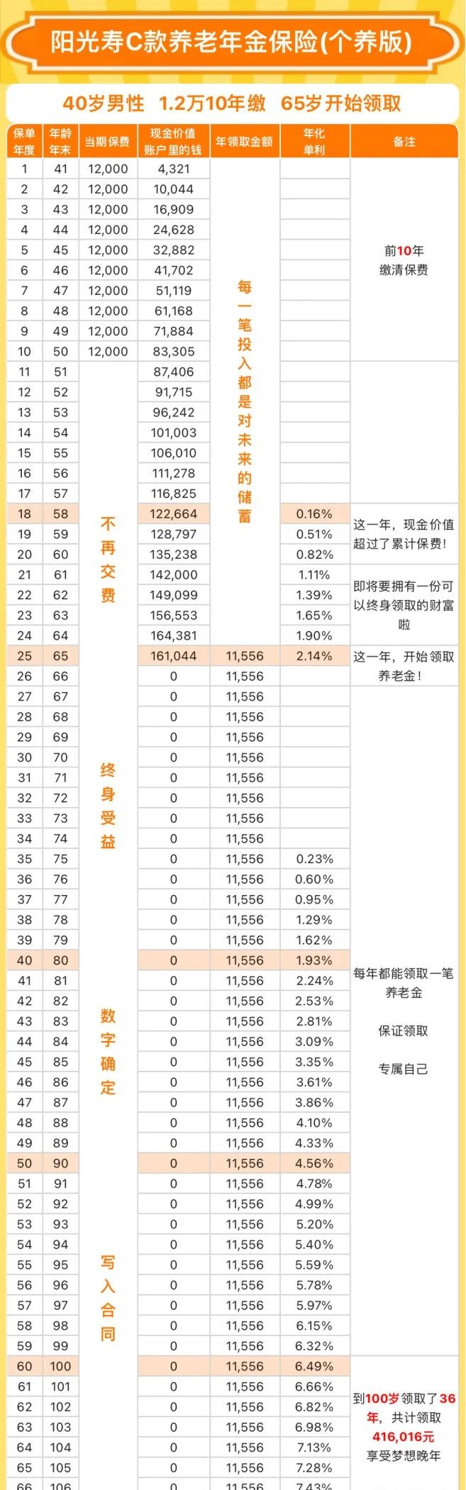 假定生存至85岁,共可领取阳光寿C养老年金223610.4 元,领取环节交3%的税合计:6708.3元,实际领取总金额:216902元 。每年领取养老年金:8342.4元(3%税后)保证领取养老年金:166847.76元(3%税后)生存至85岁,共计领取21.69万(3%税后)生存至105岁,总共领取38.37万(3%税后)