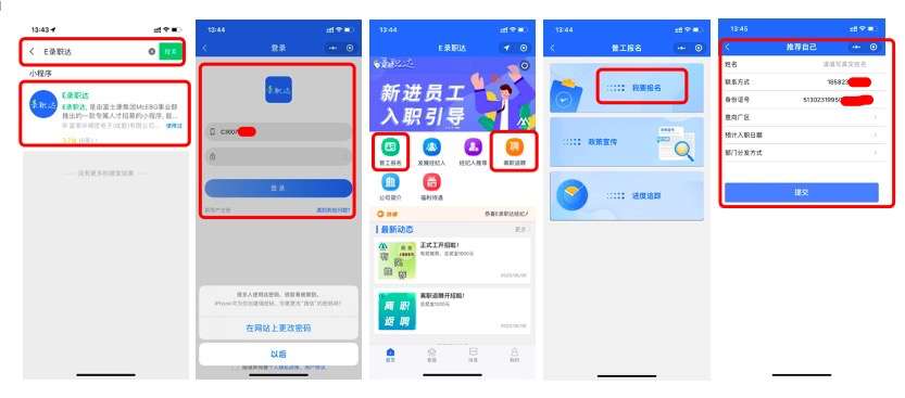 「微信搜索小程序“E录职达-点击进入E录职达-注册/登陆-普工报名/离 职返聘-我要报名-写报名信息并提交」