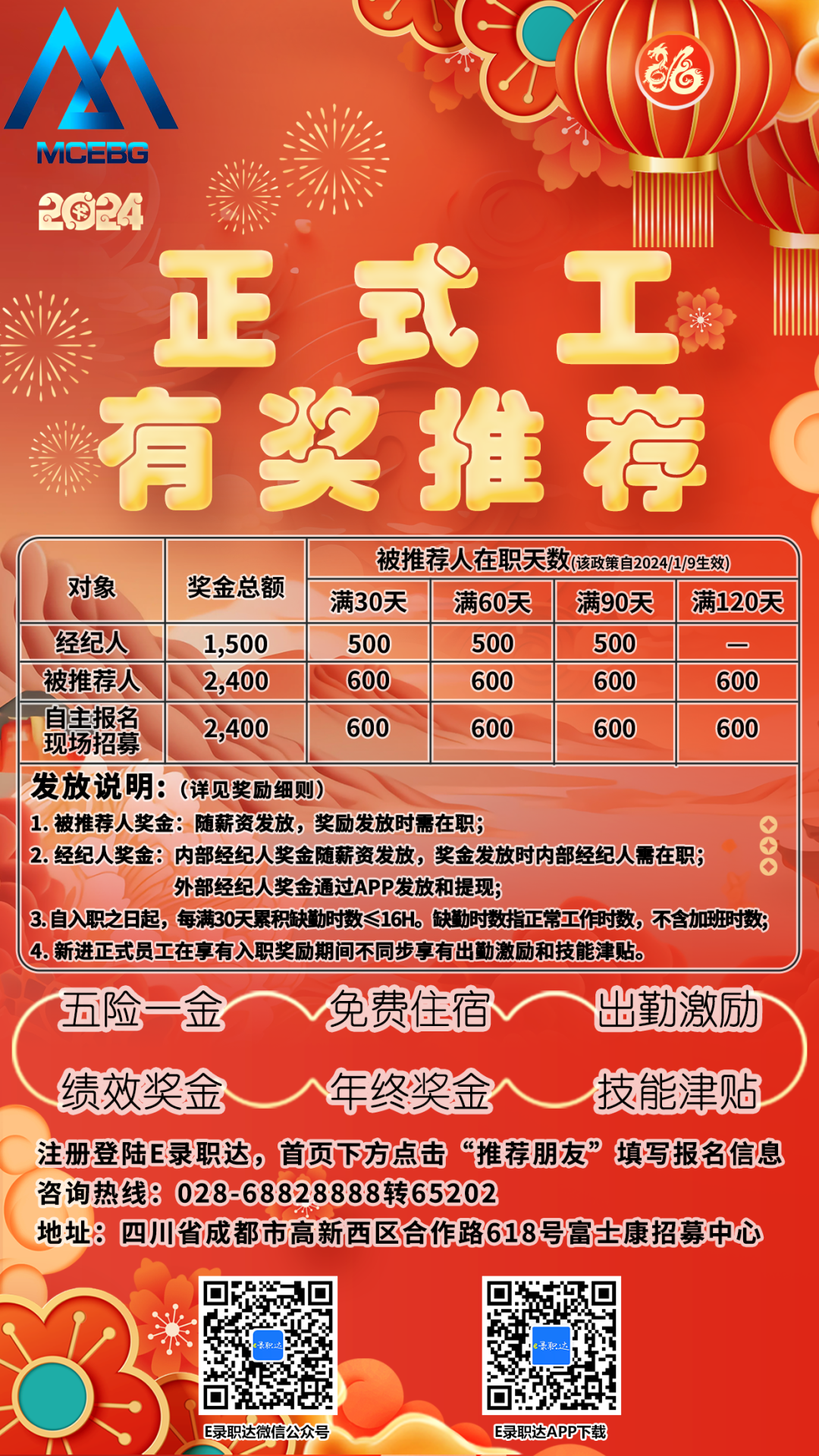 福启新年,MCEBG事业群成都厂区正式工海量招募中,年初找工作的友友们,下载注册E录职达app,线上报名,随时入职富士康MCEBG事业群,期待你的加入!