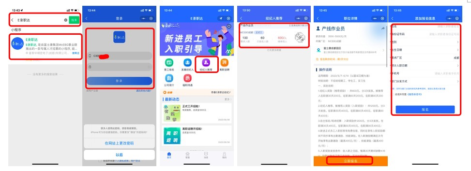 「微信搜索小程序“E录职达-点击进入E录职达-注册/登陆-经纪人推荐-接单—填写报名人信息并提交」