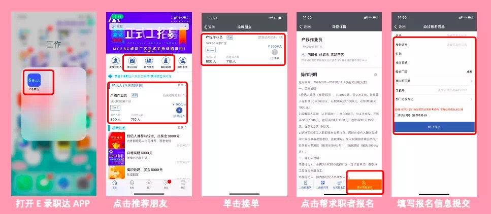 「打开APP-推荐朋友-接单-帮报名-填写报名人信息并提交」