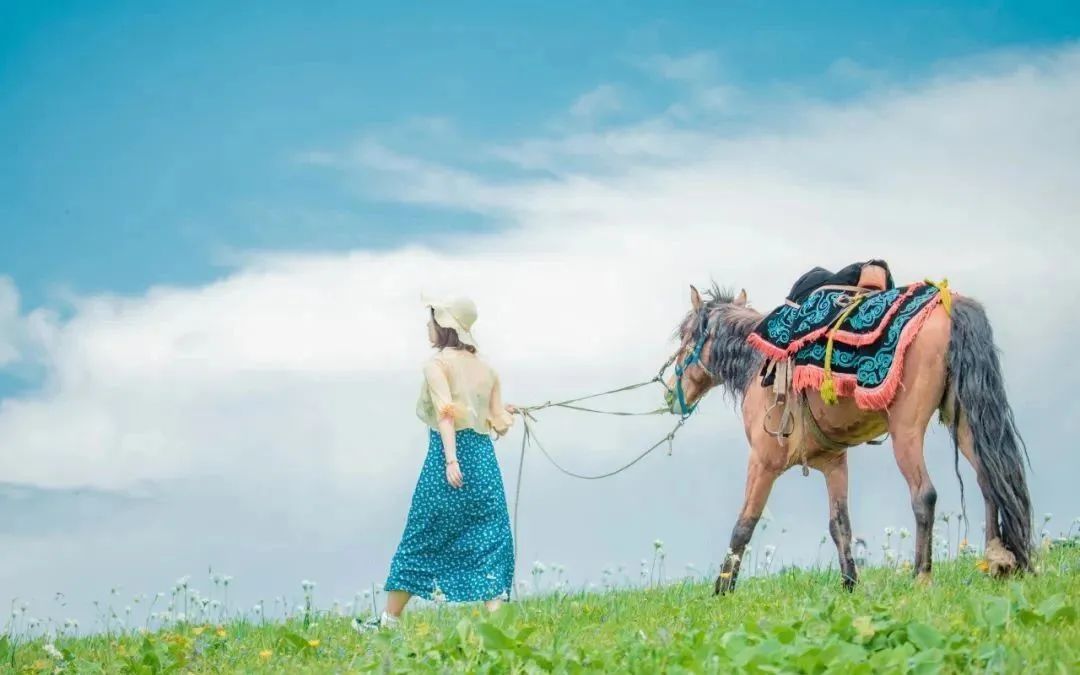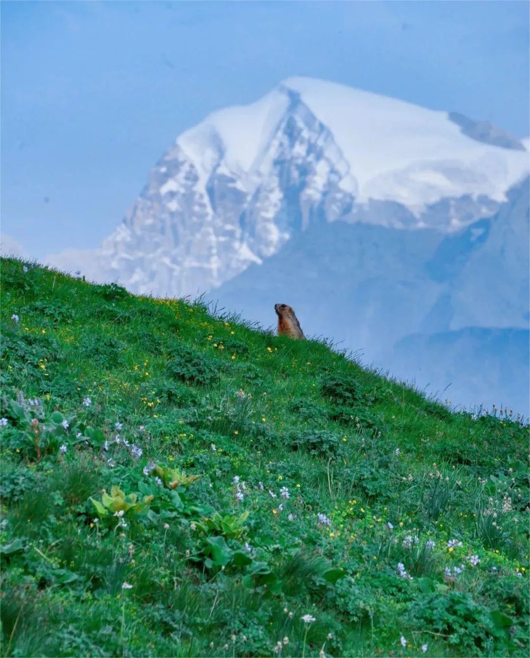 冰雪与绿野共存,天高云淡。群山延绵环抱中牛羊成群、山花遍野、点点毡房、袅袅炊烟……每一处都是大自然的礼赞。