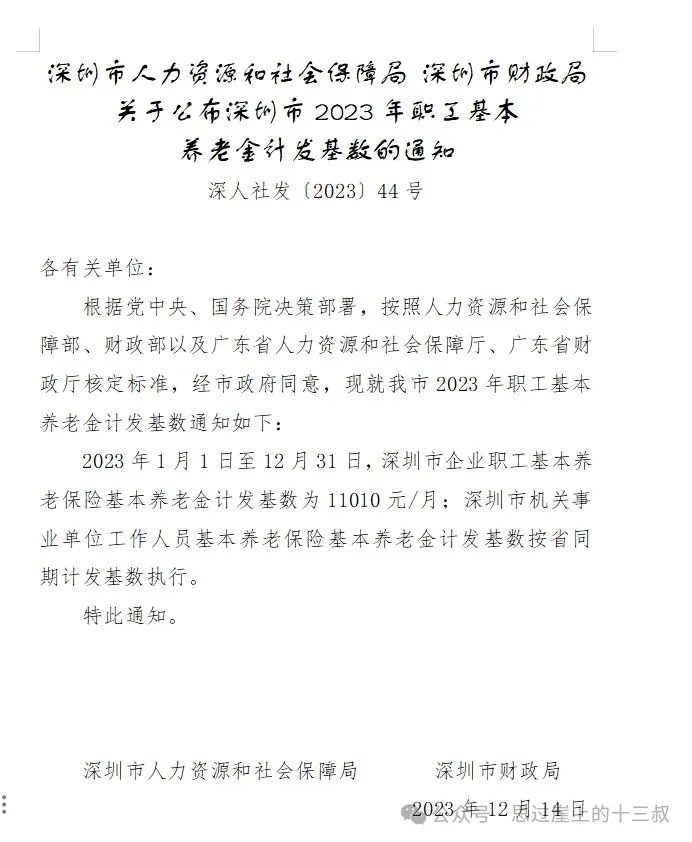 >姗姗来迟的深圳2023年职工基本养老金计发基数由官方正式公布了,11010元